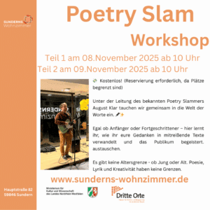 alle, die nach dem Work­shop den Mut haben, ihre eige­nen Tex­te vor Publi­kum zu prä­sen­tie­ren, gibt es am 15. Novem­ber 2025 die Mög­lich­keit, beim nächs­ten gro­ßen Poet­ry Slam in Sun­derns Wohn­zim­mer auf­zu­tre­ten. Hier kön­nen die frisch geba­cke­nen Wort­künst­ler das Gelern­te anwen­den und das Publi­kum mit ihren Tex­ten begeistern.