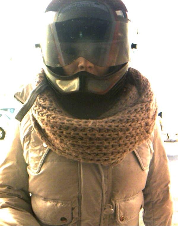 Hellbraune, wattierte Jacke und Strickschal gut erkennbar
