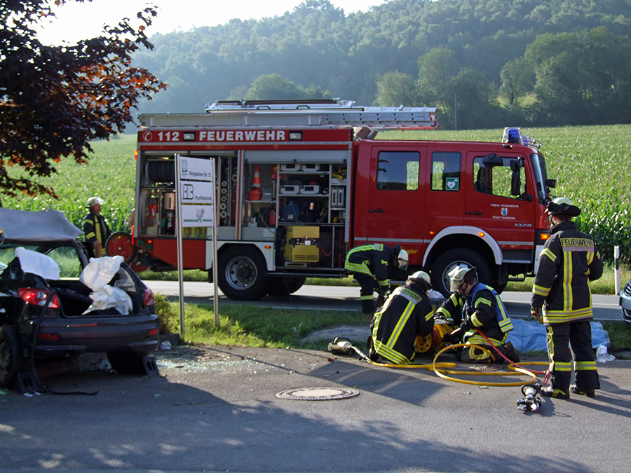 Wie Feuerwehr-Pressesprecher Frank Siedhoff meldet, wurde um 8.03 Uhr zunächst die Löschgruppe Amecke von der Kreisleitstelle in Meschede zur Unterstützung des Rettungsdienstes alarmiert. Bei Eintreffen der Feuerwehr an der Einsatzstelle wurde die verletzte Person bereits vom Rettungsdienst in ihrem Pkw versorgt. Die Löschgruppe Amecke sicherte den verunfallten Pkw und stellte den Brandschutz an der Einsatzstelle sicher, bis der Verletzte aus dem Unfallfahrzeug befreit war. Während der Versorgung des Patienten durch den Notarzt entschieden sich die eingesetzten Kräfte von Feuerwehr und Rettungsdienst, zur schonenden Rettung des Patienten ein Fahrzeug mit hydraulischem Rüstsatz nach zu fordern. Die Leitstelle alarmierte darauf hin das Hilfeleistungslöschfahrzeug des Löschzugs Sundern, das auf der Rückfahrt von einem Einsatz zur Wache war. Nach Eintreffen des HLF aus Sundern wurde mit dem hydraulischen Rettungsgerät eine große Öffnung im Heck des Fahrzeugs geschaffen, um den Patienten schonend aus dem Fahrzeug heben zu können. Insgesamt waren 20 Feuerwehrkräfte am Einsatz beteiligt.
