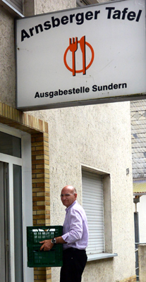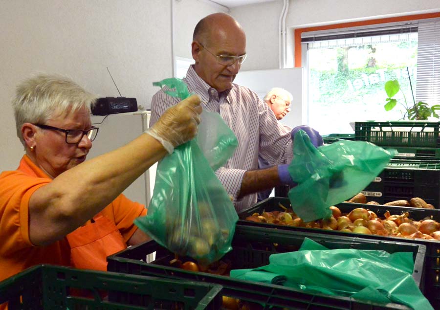 Das Intermezzo mit den Zwiebeln fand in der Sunderner Ausgabestelle der Arnsberger Tafel statt. Vorher hatte der Gast trotz des warm-schwülem Wetters gemeinsam mit anderen Helfern den Lieferwagen entladen, denn der musste schnell wieder bereit sein, um weitere Lebensmittel abzuholen.