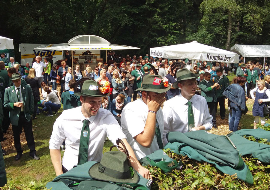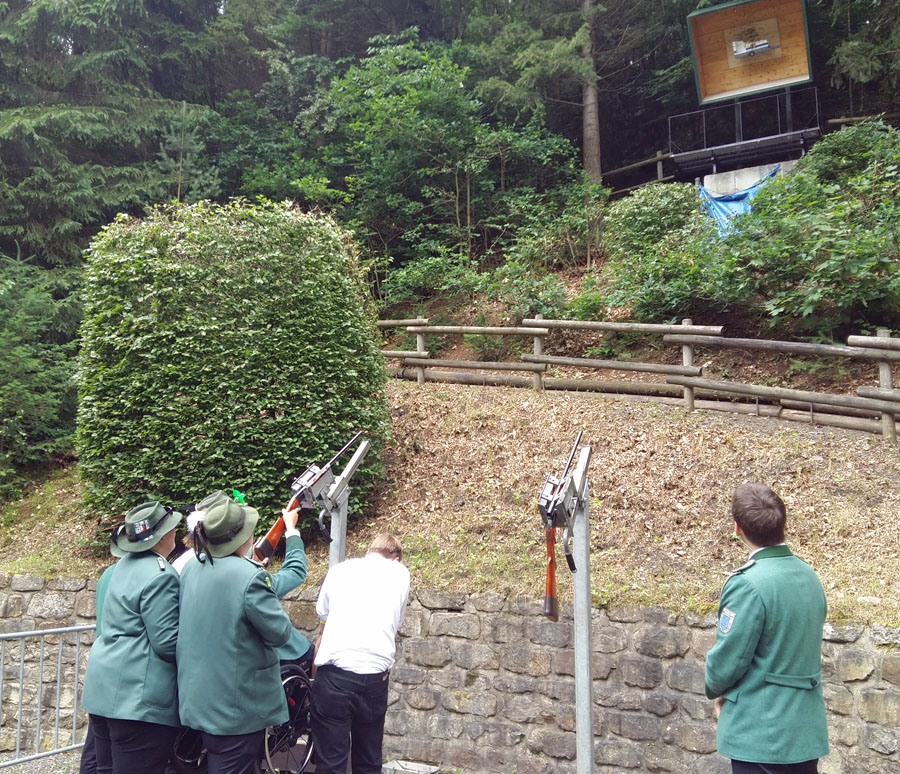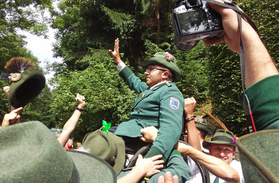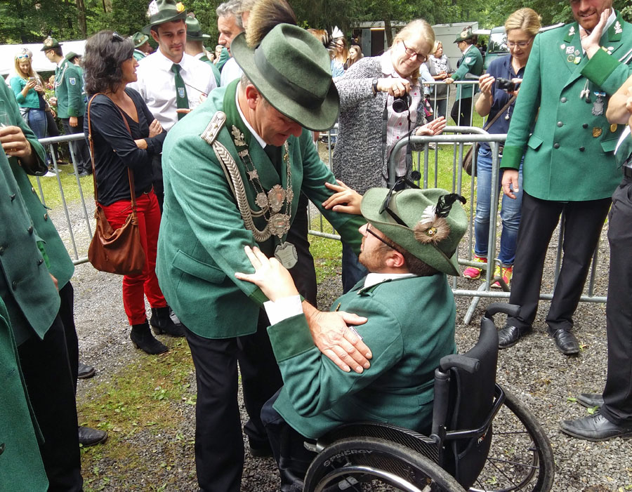 In Rumbeck sehr aktiv ist auch der neue Geck Miguel Sanchez-Flores, obwohl er knapp jenseits der Rumbecker Grenzen an der schönen Aussicht in Arnsberg wohnt. Der 22-Jährige mit spanischen Wurzeln macht zur Zeit eine Ausbildung als technischer Produktdesigner im Josefsheim in Olsberg. Am spannenden Geckschießen konnte er auch als Rollstuhlfahrer teilnehmen, weil ihn jeweils vier Schützenbrüder in Gewehrhöhe hoben. Der Jubel bei den Schützen war riesig, als er im entscheidenden Moment und nicht zum ersten Mal einen Volltreffer landete. Von „Mir kommen die Tränen!“ bis „Das ist ja das geilste überhaupt!“ reichten die Kommentare der Gratulanten, die auf ihn zu stürmten.