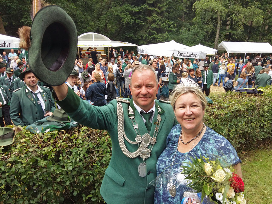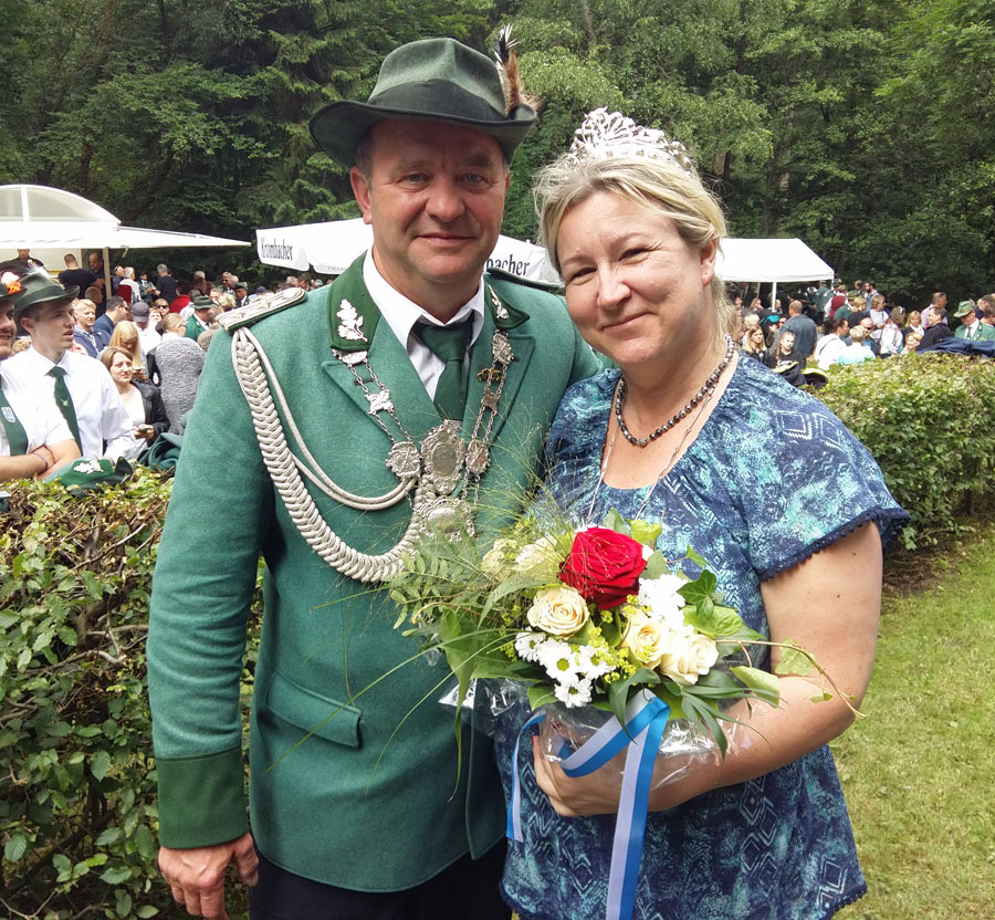 Für Reimund Lübben, den 55-jährigen selbständigen Gerüstbauer, war es der zweite Versuch unter der Vogelstange. Im Vorjahr hatte er noch geübt, diesmal konnte er sich im 142. Schuss gegen seine Mitbewerber Sebastian Grossert und Wolfgang Krien durchsetzen. Mit ihm wird seine Ehefrau, die 52-jährige Intensivkrankenschwester Susanne de Vries-Lübben das Rumbecker Schützenvolk regieren. Beide sind zugezogene Rumbecker, leben aber nunmehr seit 21 Jahren im Ort und schätzen die Überschaubarkeit sehr. Reimund Lübben ist auch im Vorstand der Schützen aktiv.