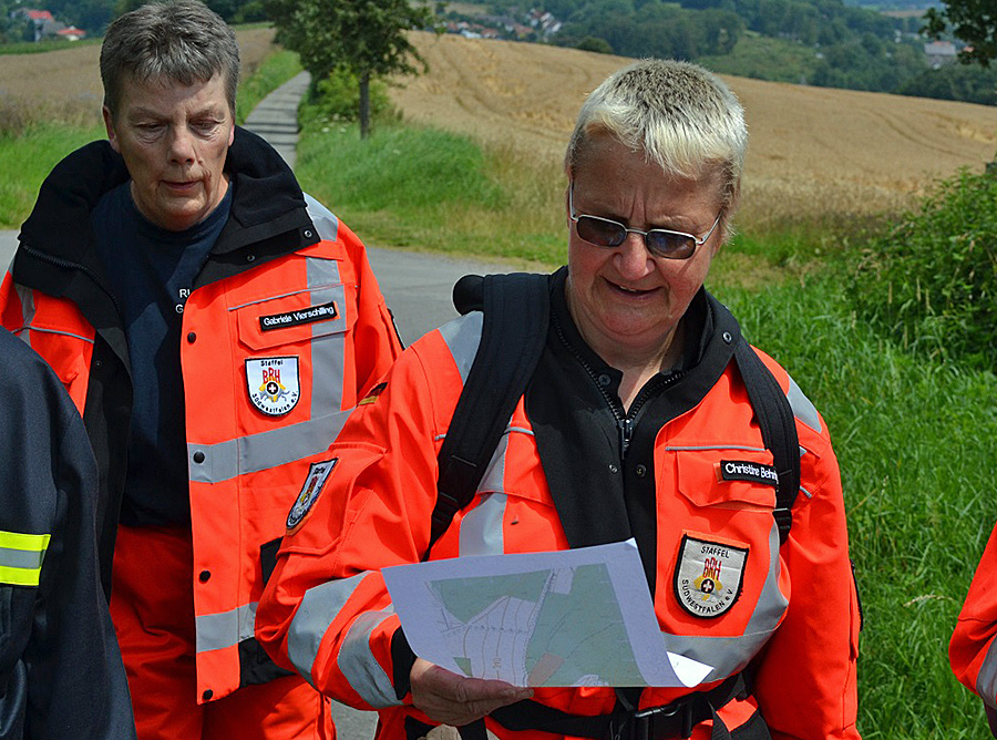 Für die schnellst mög­li­che Suche der in das nahe­lie­gen­de Wald­stück geflüch­te­ten Per­so­nen wur­de die Ret­tungs­hun­de­staf­fel ein­ge­setzt. Das Wald­stück wur­de in ver­schie­de­ne Such­ge­bie­te ein­ge­teilt, in denen meh­re­re Such­teams der Hun­de­staf­fel ein­ge­setzt wur­den. Jedes Team, bestehend aus einem Hun­de­füh­rer samt Ret­tungs­hund, einem Such­grup­pen­hel­fer und ein oder zwei orts­kun­di­gen Feu­er­wehr­leu­ten, wur­de mit einem für ihr Such­ge­biet aus­ge­stell­ten Kar­ten­aus­druck, einem vor­pro­gram­mier­ten GPS-Gerät und einem Funk­ge­rät aus­ge­stat­tet. Im Such­ge­biet ange­kom­men waren die fei­nen Nasen der Haupt­ak­teu­re gefragt. Die­se funk­tio­nier­ten sogar so gut, dass sich die ver­miss­ten Per­so­nen, wel­che durch Mit­glie­der der Jugend­feu­er­wehr gespielt wur­den, gleich noch ein­mal ver­ste­cken muss­ten, da sie von den Ret­tungs­hun­den in Win­des­ei­le gefun­den wurden.