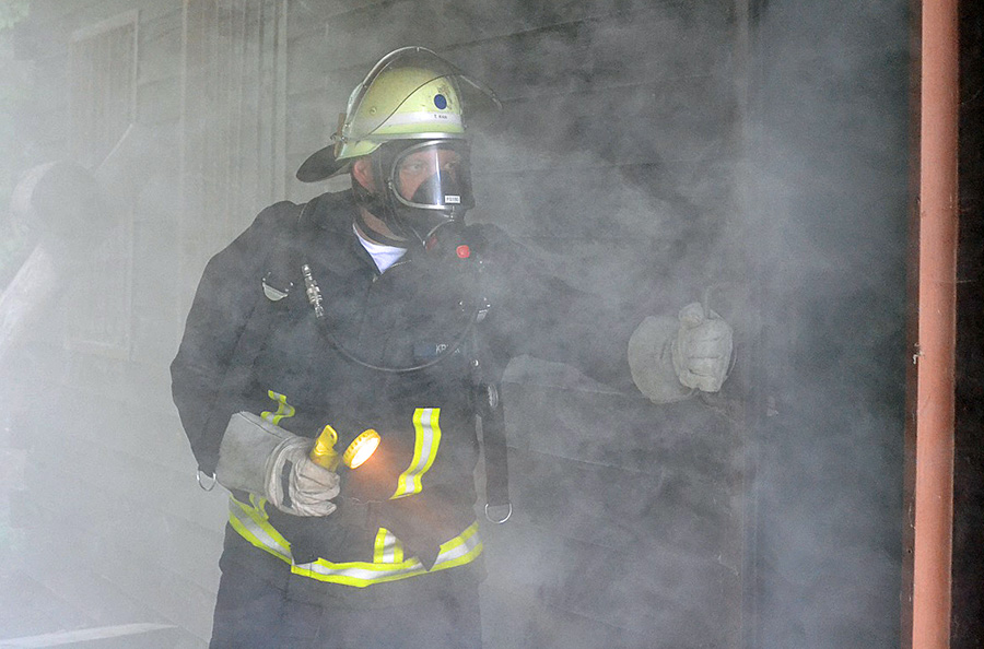 Nach der Explo­si­on wur­de eine Per­son in der voll­stän­dig ver­rauch­ten Grill­hüt­te ver­misst. Ein Zeu­ge hat­te beob­ach­tet, dass wei­te­re Per­so­nen vom Gelän­de der Grill­hüt­te in ein nahe­lie­gen­des Wald­ge­biet geflüch­tet waren. Die Auf­ga­be der Feu­er­wehr bestand dar­in, die ver­miss­te Per­son aus dem ver­qualm­ten Gebäu­de zu ret­ten und sicher zu stel­len, dass nicht noch wei­te­re Per­so­nen in der Grill­hüt­te zu Scha­den gekom­men waren. Wäh­rend ein Trupp unter Atem­schutz zur Men­schen­ret­tung vor­ging, wur­de die Was­ser­ver­sor­gung von einem etwa 300 Meter ent­fern­ten und 30 Höhen­me­ter unter­halb der Ein­satz­stel­le gele­ge­nen Unter­flur­hy­dran­ten sichergestellt.
