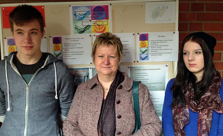 Arnsberg. Fabian Bellair und Chantale Yildirim als Vertreter der Ruth-Cohn-Schule stellten die Arbeit der Com-Scouts bei der Lernwerkstatt „gesagt. getan“ vor. Auch NRW-Schulministerin Sylvia Löhrmann überzeugte sich von dem guten