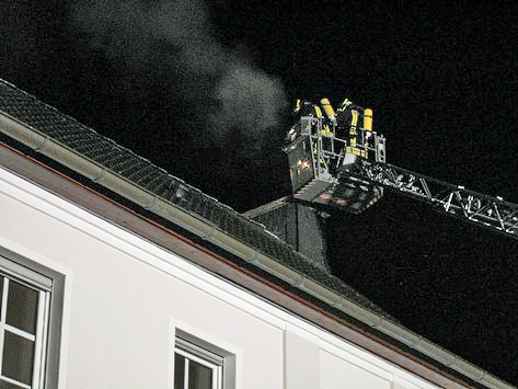Zum Abschluss der Brandbekämpfung erstickte die Feuerwehr auf Empfehlung des Bezirksschornsteinfegermeisters zwischen dem Abluftausgang der Heizungsanlage und der Reinigungsklappe eine Ansammlung von glühendem Brandgut mit Hilfe eines Sechs-Kilo-Pulver-Handlöschers – eine