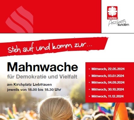 Arnsberg/Sundern. Der Caritasverband Arnsberg-Sundern e.V. lädt für Mittwoch, 22.05., um 18.00 Uhr erneut zu einer Mahnwache auf den Kirchplatz der Liebfrauengemeinde, Hellefelder Straße 15, ein. Die Mahnwache thematisiert die in großen