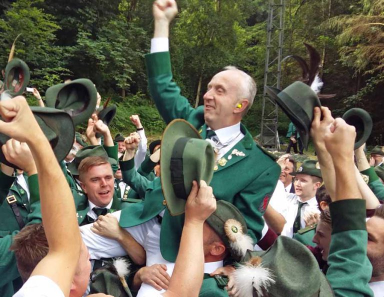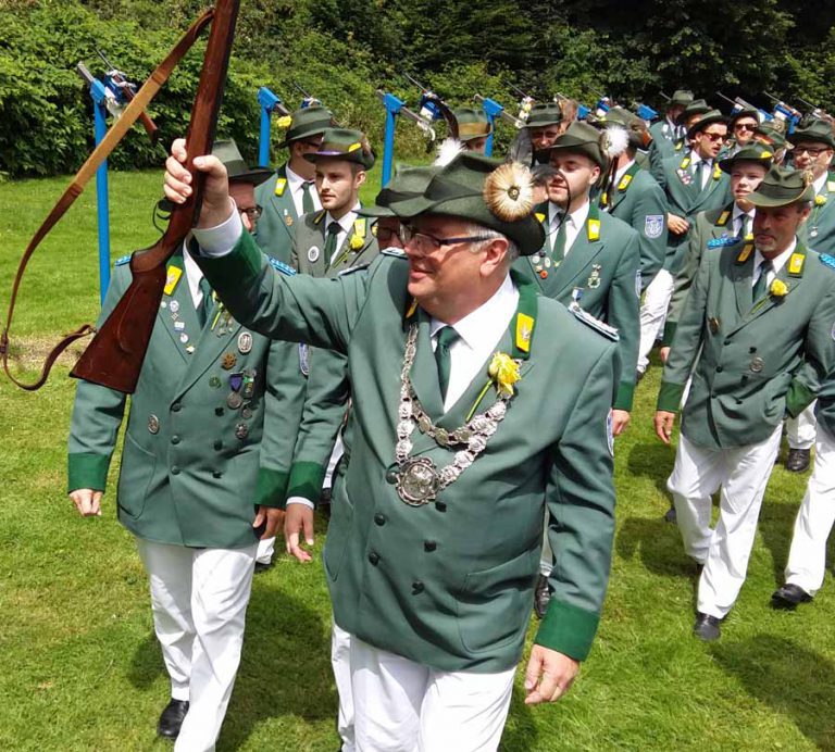 „Nun stehe ich hier mit der Kette um den Hals auf der schönsten Vogelwiese des Sauerlands. Und ich will keine vielen Worte verlieren, denn wir wollen feiern“, sagte Detlef Kulke,