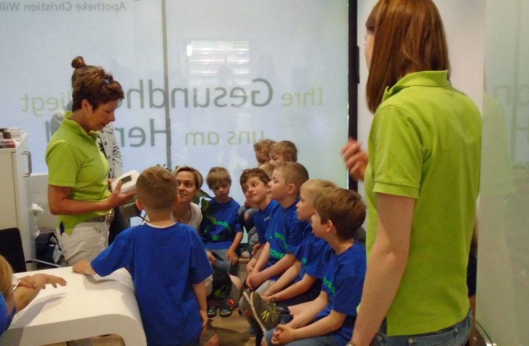 Ein weiterer Höhepunkt des Projektes war der Besuch der „Gesund leben Apotheke“ in der Fußgängerzone. Mit großem Interesse hörten sich die Kinder die Informationen an und stellten viele Fragen. Am