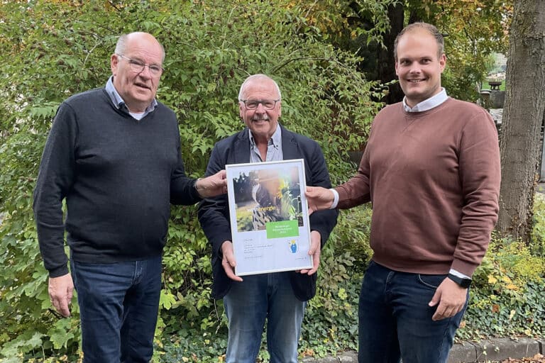 Bürgermeister Klaus-Rainer Willeke und Johannes Kobeloer, Vertreter der Westenergie AG, haben im Rathaus den Preisträger des Umwelt- und Klimaschutzpreises 2023 der Stadt Sundern ausgezeichnet. Der diesjährige Preis geht an den Heimatverein Allendorf für die Errichtung einer großflächigen Blühwiese. Das Projekt wurde mit einem Preisgeld von 2.500 Euro prämiert.