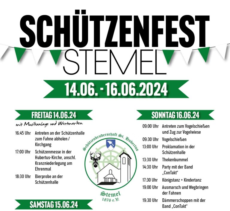 Sundern/Stemel. Am 3. Juni-Wochenende, vom 14. bis 16. Juni 2024 feiert die Schützenbruderschaft St. Hubertus Stemel 1876 e.V. wieder ihr traditionelles Schützenfest. Zu diesem Fest sind alle Bewohner von Stemel,