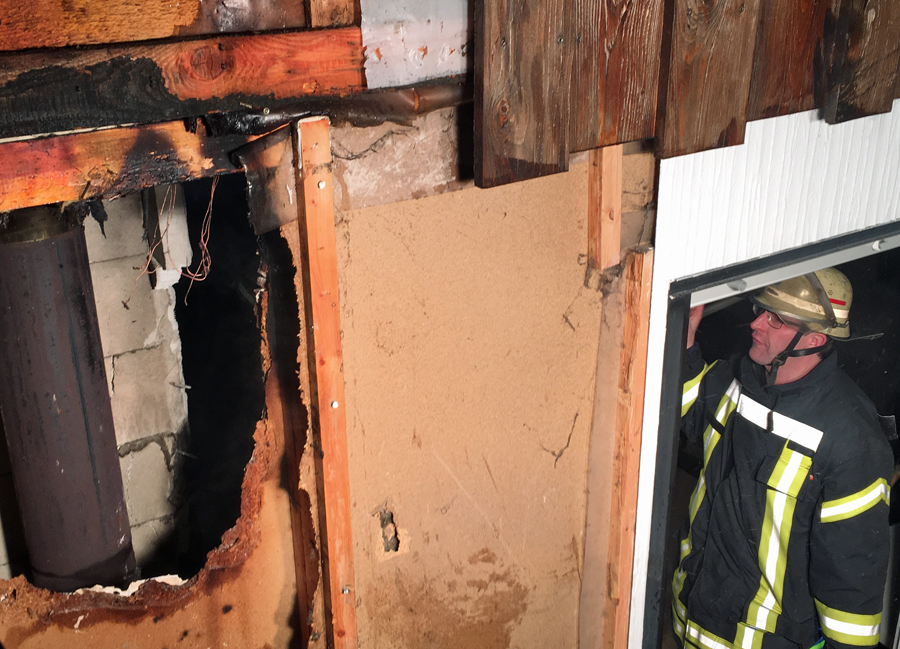 Gegen 22.35 Uhr wurde der Löschzug Sundern dann in den „Schwemker Ring“ alarmiert. Im betroffenen Wohnhaus konnten die Einsatzkräfte der Feuerwehr eine leichte Rauchentwicklung und Brandgeruch wahrnehmen. Mit der Wärmebildkamera wurde daraufhin der Bereich um den Kamin kontrolliert. Aufgrund der Erkenntnisse dieser Kontrolle gingen die Einsatzkräfte von einem Brand oder Schwelbrand in der Zwischendecke über dem Kamin bzw. in der Außenwand des Fertighauses aus. Daher wurden vorsichtshalber ein weiteres Löschfahrzeug und der Einsatzleitwagen von der Feuerwache angefordert. Im Gebäude öffneten die Wehrleuten unter Atemschutz Decke und Wandverkleidung. Dabei bestätigte sich die Brandvermutung, da ein bereits ausgedehnter Brand in der Außenwand aktiv war. Von außen wurde die Wand daher ebenfalls geöffnet und das Feuer abgelöscht. „Durch das gezielte Arbeiten unter Einsatz der Wärmebildkamera konnte der Gebäude- und Wasserschaden am und im Gebäude für den Brandverlauf noch relativ gering gehalten werden,“ so Jürgen Voss, stellv. Pressesprecher der Sunderner Wehr. „Warum es zu dem Brand gekommen ist, wird in den nächsten Tagen ein Brandermittler der Kriminalpolizei aufklären. Ein technischer Defekt in der Elektrik als Ursache für den Brand ist ebenfalls nicht auszuschließen.“ Der Löschzug Sundern war mit vier Fahrzeugen und 24 Einsatzkräften unter Leitung von Löschzugführer Andreas Siebert vor Ort.