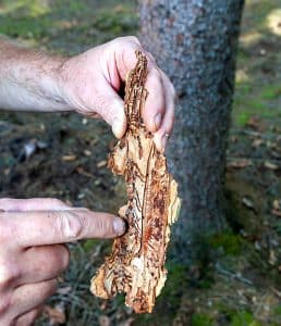 - Zu erkennen sind befallene Wirtsbäume an dem herausrieselnden Bohrmehl.