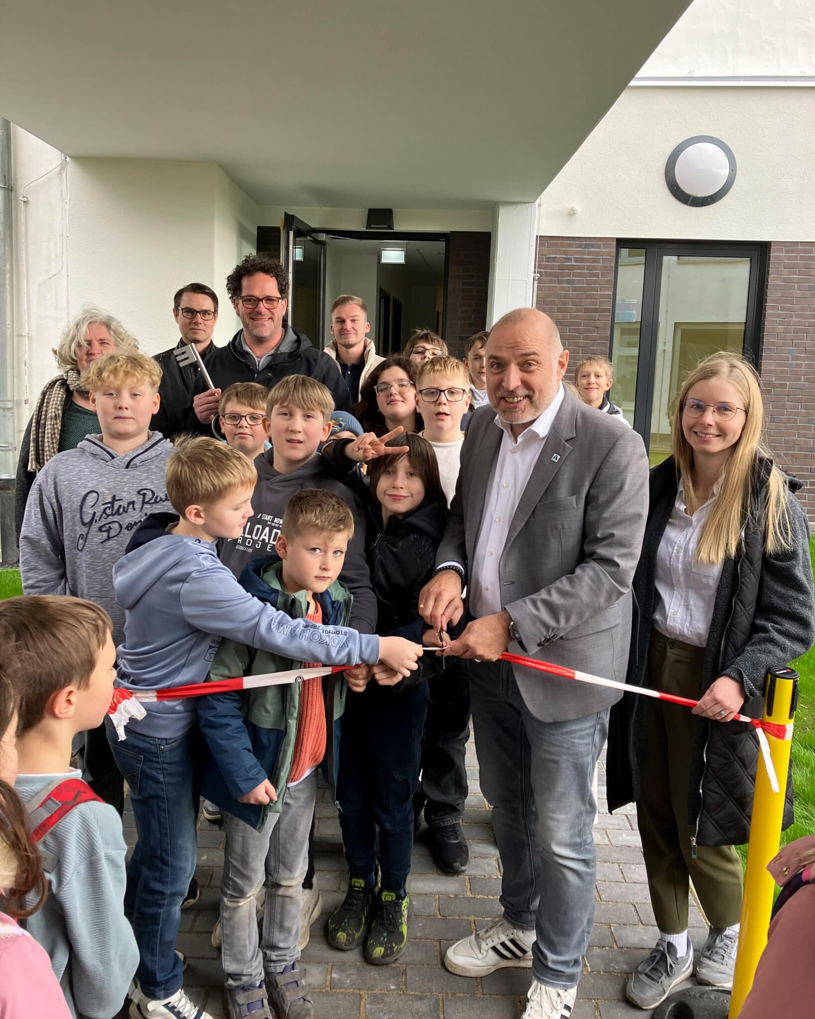 Arnsberg. An der Fröbelschule in Arnsberg sind jetzt die Sanierungsarbeiten im Bereich des Offenen Ganztags erfolgreich abgeschlossen worden. Im Beisein von Bürgermeister Ralf Paul Bittner sowie der Beteiligten des Gebäudemanagements der Stadt Arnsberg, Planer und Architekten sowie der Ausschussvorsitzeden Nicole Jerusalem und der Vorsitzenden des Fördervereins Hawei, Gisela Meiske, wurden die Räume an die Schule mit einem kleinen Festakt übergeben. Architekt Michael Nölle überreichte dazu den symbolischen Schlüssel für den OGS Bereich. Schülerinnen und Schüler sowie Lehrerinnen und Lehrer der städtischen Förderschule für emotionale und soziale Entwicklung, Lernen und Sprache haben die frisch sanierten Räumlichkeiten bereits in Betrieb genommen. Insgesamt wurden an der Schule rund 2,4 Millionen Euro (mit Fördermitteln) investiert.