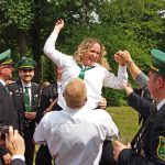 Moosfelde. Zum zweiten Mal schoss beim nunmehr 37. Schützenfest des Schützenvereins Moosfelde eine Frau den Vogel ab. Vier Jahre nach ihrer Mutter Viviane Rüschenschmidt gelang dies der erst 18-jährigen Saskia Friedrich. Die neue Moosfelder Königin ist noch Schülerin am Berufskolleg am Eichholz. Zum Mitregenten erkor sie ihren Freund Fabian Borucki, mit dem sie auch ihre Wohnung in Ense-Bremen teilt. Der 20-jährige Garten- und Landschaftsbauer hatte ebenfalls kräftig mitgeschossen. Unter strahlender Sonne und bei sommerlichen Temperaturen ging es dem Aar in einem Vogelschießen, an den sich zahlreiche Moosfelder und auch einige Moosfelderinnen beteiligten, zügig an den Kragen. Um 12.03 Uhr war es dann soweit. Der Vogel fiel nach dem 157. Schuss und die Freude bei der neuen Regentin war riesengroß.