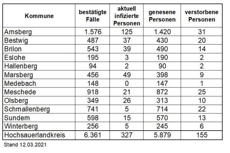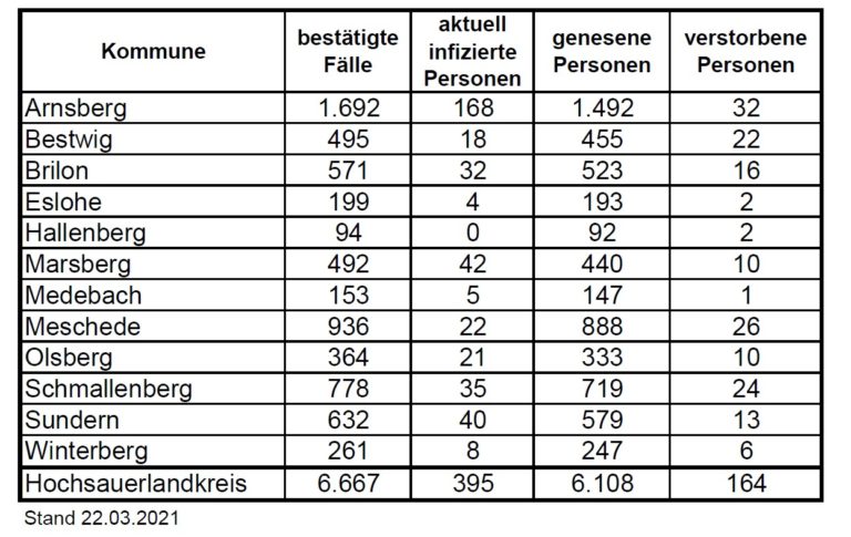 Hochsauerlandkreis. Im Vergleich zum Vortag verzeichnet die Statistik des Gesundheitsamtes des Hochsauerlandkreises am Mittwoch kreisweit 39 Neuinfizierte und 35 Genesene. Die 7‑Tage-Inzidenz beträgt 90,1. Insgesamt gibt es aktuell 370 Infizierte,