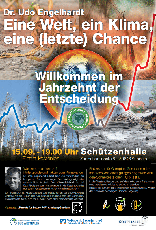 Sundern. Auf Einladung der „ParentsForFuture“ Ortsgruppe Arnsberg-Sundern hielt Dr. Udo Engelhardt, Meeresbiologe und Korallenriff-Ökologe, am vergangenen Mittwochabend einen Vortrag zum Thema „Eine Welt, ein Klima, eine (letzte) Chance“. Mit ca.