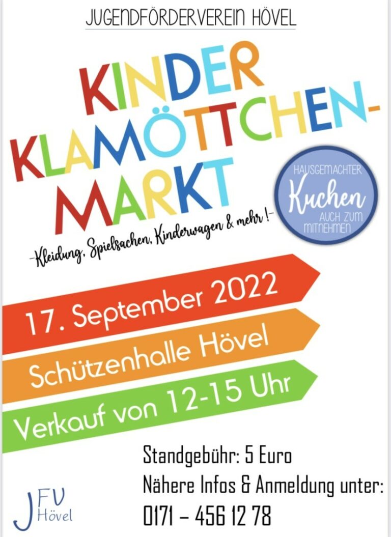 Sundern/Hövel. Am 17. September 2022 veranstaltet der Jugendförderverein Hövel einen Kinder-Klamottenmarkt in der Schützenhalle von Hövel. Hierfür können ab sofort Verkaufstische reserviert werden. Die Gebühr pro Tisch liegt bei 5 Euro. Der