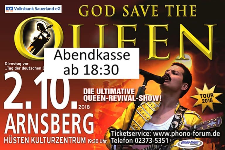 Hüsten. The Show must go on. Nach dem grandiosen Erfolg im Oktober 2017 im Sauerlandtheater kommt die Queen-Revival Band „God Save The Queen“ zurück nach Arnsberg, diesmal nach Hüsten ins