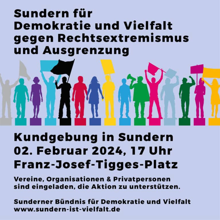 Sundern. Am kommenden Freitag wird Sundern die wahrscheinlich größte Kundgebung seiner Geschichte erleben, freuen sich die Organisatoren. Immer mehr Einzelpersonen, Vereine und Unternehmen unterstützen demnach den Aufruf „Für Demokratie und Vielfalt – gegen Rechtsextremismus und Ausgrenzung!“. Um 17.00 Uhr werden sich auf dem Franz-Josef Tigges-Platz Vertreterinnen und Vertreter verschiedenster Organisationen in unterschiedlicher Art und Weise positionieren.