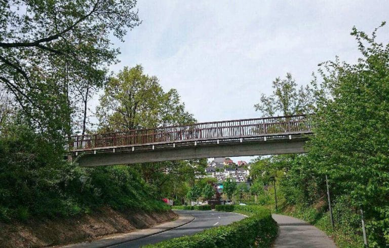 Langscheid. Die Sanierung der Gehwegbrücke Hakenbrinkweg über die L 687 im Kurpark Langscheid beginnt. Die Fußgängerbrücke ist beim Unterqueren mit einem Lkw-Zug mit aufstehendem Bagger durch Anprall mit dem Baggerarm bereits