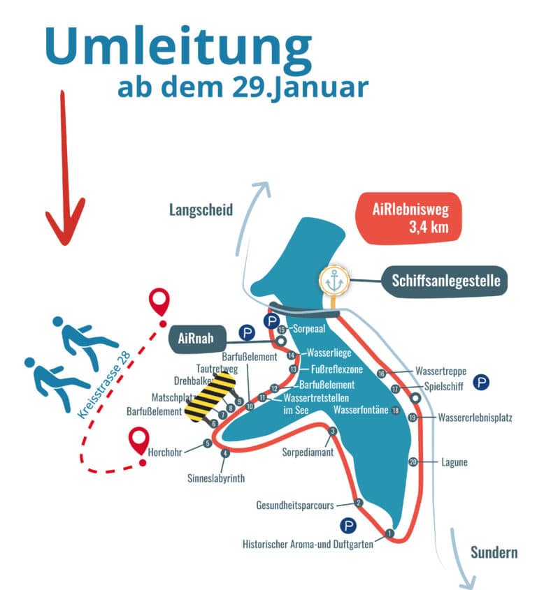 Amecke. Ab dem heutigen 29.01. werden wichtige Instandsetzungsarbeiten am Airlebnisweg in Amecke durchgeführt. Daher wird in den nächsten drei bis vier Wochen (je nach Wetterlage) ein Teilstück des Weges hinter dem Campingplatzes in Amecke gesperrt sein. Aus Richtung Amecke kommend wird der der Weg hinter der Station Horchohr Richtung K28 umgeleitet. Vom Cafe „Airnah“ aus ist der Weg bis zum Ende des Campingplatzes (Höhe Wassertretstelle) begehbar.