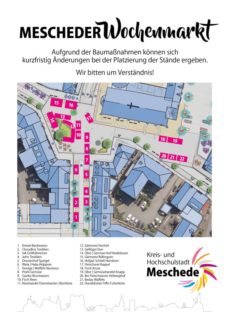 Meschede. Die Baumaßnahmen auf dem Kaiser-Otto-Platz schreiten voran. Daher müssen etliche Stände auf dem Mescheder Wochenmarkt verlegt werden. Das Stadtmarketing Meschede hat die neuen Standorte in einer Grafik dargestellt. Die