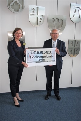 Hochsauerlandkreis. Schulministerin Yvonne Gebauer überreichte Landrat Dr. Karl Schneider im Kreishaus Meschede einen symbolischen Scheck über 4,4 Millionen Euro aus dem Digitalpakt Schule. Mit der Übergabe der Förderbescheide am Mittwoch,