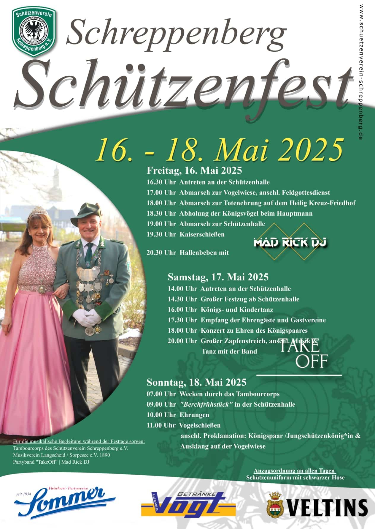 Wie in den vergangenen Jahren dürfen sich die Festbesucher auf ein tolles musikalisches Programm freuen. Am Freitagabend wird DJ MadRick mit seinen Beats für eine unvergessliche Partystimmung in der Berbketalhalle sorgen. Am Samstag wird die Tanzband „Takeoff“ die Gäste auf die Tanzfläche locken und für ausgelassene Feierlaune sorgen. Begleitet wird das Fest zudem vom Musikverein Langscheid und dem Tambourcorps des Schützenvereins Schreppenberg, die an allen Festtagen für die passende musikalische Untermalung sorgen.
