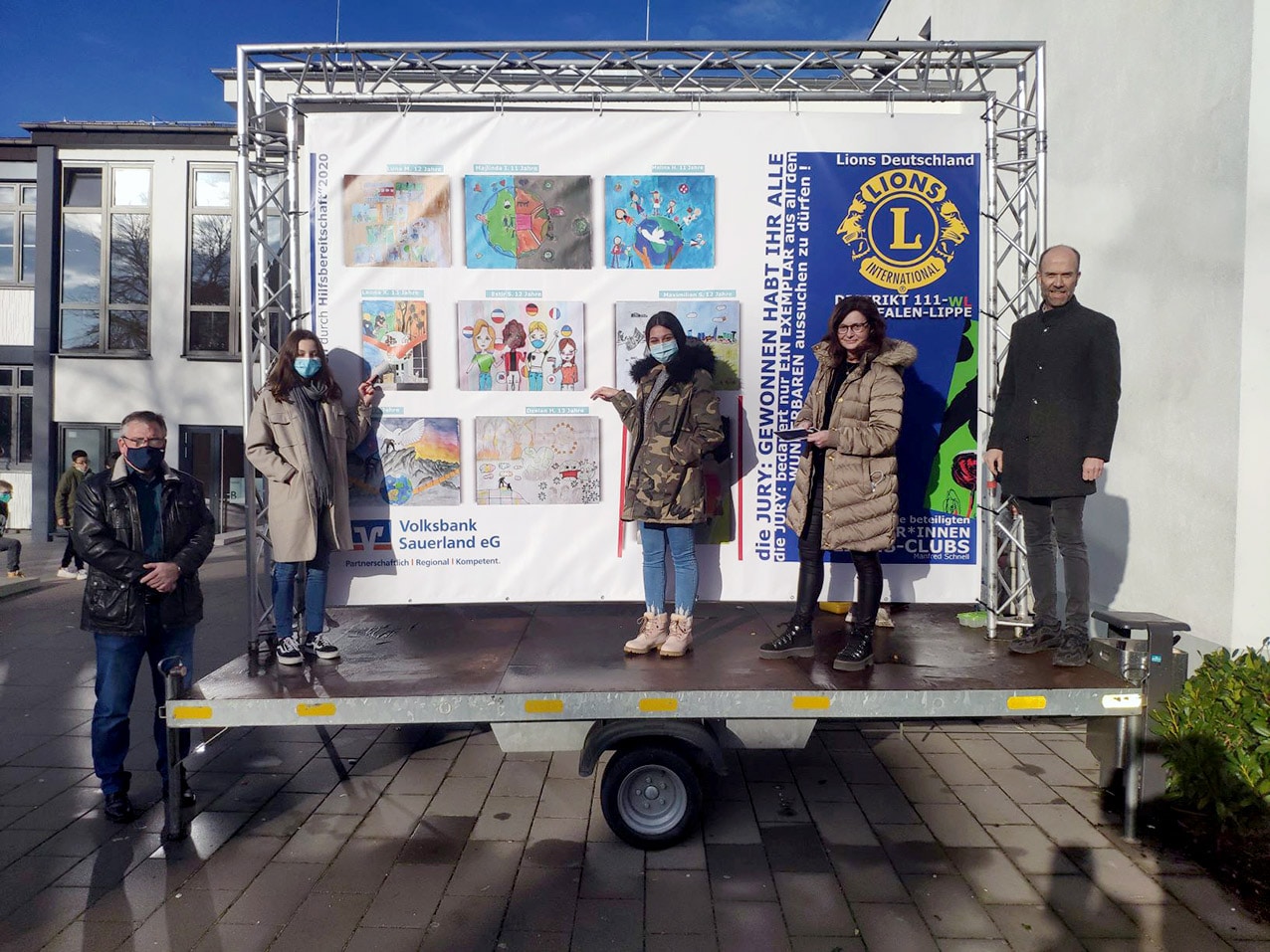 Der Lions Club Neheim-Hüsten war so begeistert von den eingereichten Ideen, dass er kurzerhand eine Auswahl der prämierten Bilder auf einer großen Plane montierte und diese sowohl auf dem Neheimer Marktplatz wie auch jeweils für ein paar Tage auf den Schulhöfen der teilnehmenden Schulen installierte. Die neun ausgewählten Plakate wurden zudem mit jeweils 50 Euro prämiert.