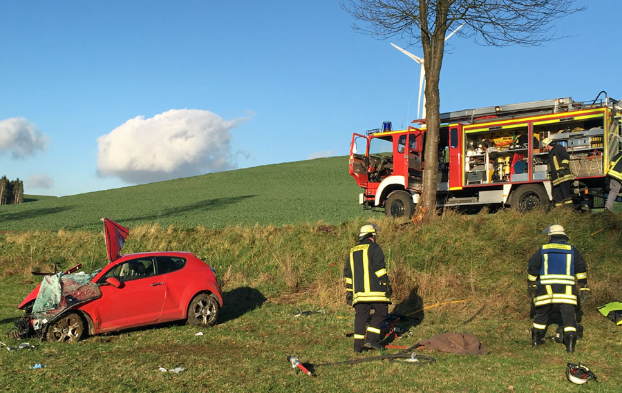 Während des Brandeinsatzes in Altenhellefeld wurden die Löschgruppen aus Hachen und Langscheid gegen 13.45 Uhr zu einem schweren Verkehrsunfall mit eingeklemmter Person im Ortsteil Hövel alarmiert. Auf der Kreisstraße zwischen Hövel und Wettmarsen war ein 22-jähriger Autofahrer mit seinem Alfa Romeo aus bisher ungeklärter Ursache gegen einen Baum geprallt. Das Fahrzeug wurde nach dem Anprall auf eine Wiese geschleudert, wo es auf der Seite liegen blieb. Aufgrund der Wucht des Aufpralls wurde der Motor aus dem Fahrzeug gerissen. Der junge Fahrer war in seinem Fahrzeug eingeklemmt.