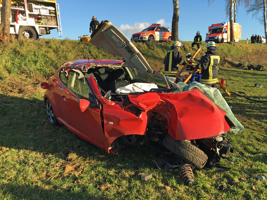 Während des Brandeinsatzes in Altenhellefeld wurden die Löschgruppen aus Hachen und Langscheid gegen 13.45 Uhr zu einem schweren Verkehrsunfall mit eingeklemmter Person im Ortsteil Hövel alarmiert. Auf der Kreisstraße zwischen Hövel und Wettmarsen war ein 22-jähriger Autofahrer mit seinem Alfa Romeo aus bisher ungeklärter Ursache gegen einen Baum geprallt. Das Fahrzeug wurde nach dem Anprall auf eine Wiese geschleudert, wo es auf der Seite liegen blieb. Aufgrund der Wucht des Aufpralls wurde der Motor aus dem Fahrzeug gerissen. Der junge Fahrer war in seinem Fahrzeug eingeklemmt.