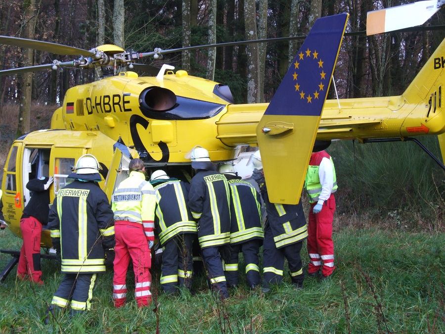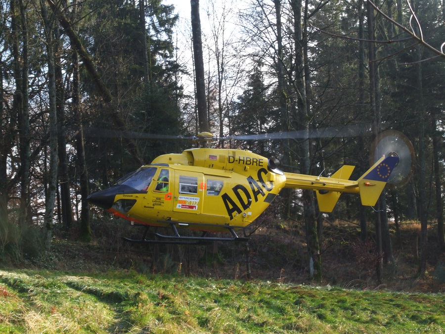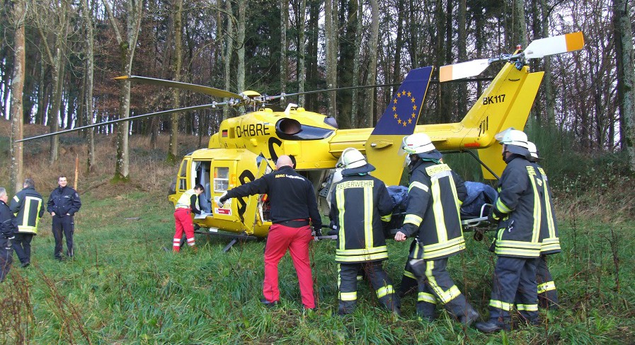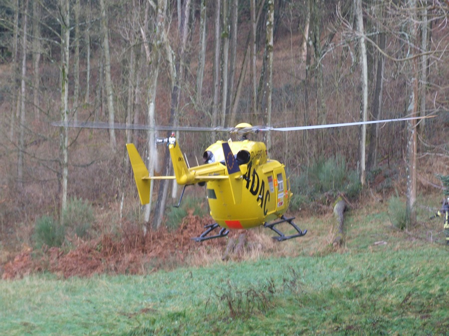 Da er sich jedoch eine Bein­ver­let­zung zu gezo­gen hat­te und der Trans­port zum etwa 150 Meter ent­fern­ten Ret­tungs­wa­gen über einen stei­len Wald­hang hät­te erfol­gen müs­sen, ent­schied sich die Not­ärz­tin, einen Ret­tungs­hub­schrau­ber anzu­for­dern. Der über die Kreis­leit­stel­le ange­for­der­te Ret­tungs­hub­schrau­ber aus Sie­gen konn­te die Ein­satz­stel­le jedoch auf­grund der schlech­ten Wit­te­rungs­be­din­gun­gen auf der Flug­rou­te nicht anflie­gen und muss­te den Ein­satz abbre­chen. Glück­li­cher­wei­se konn­te der  Ret­tungs­hub­schrau­ber „Chris­toph Rhein­land“ aus Köln die Schlecht­wet­ter­la­ge umflie­gen und auf einer Lich­tung nahe der Ein­satz­stel­le zur Lan­dung gehen, wobei das flie­ge­ri­sche Kön­nen des Pilo­ten gefor­dert war. Das Gefäl­le des Lan­de­plat­zes lag für die Lan­dung des Ret­tungs­hub­schrau­bers gra­de noch im Grenz­be­reich, so der Pilot.