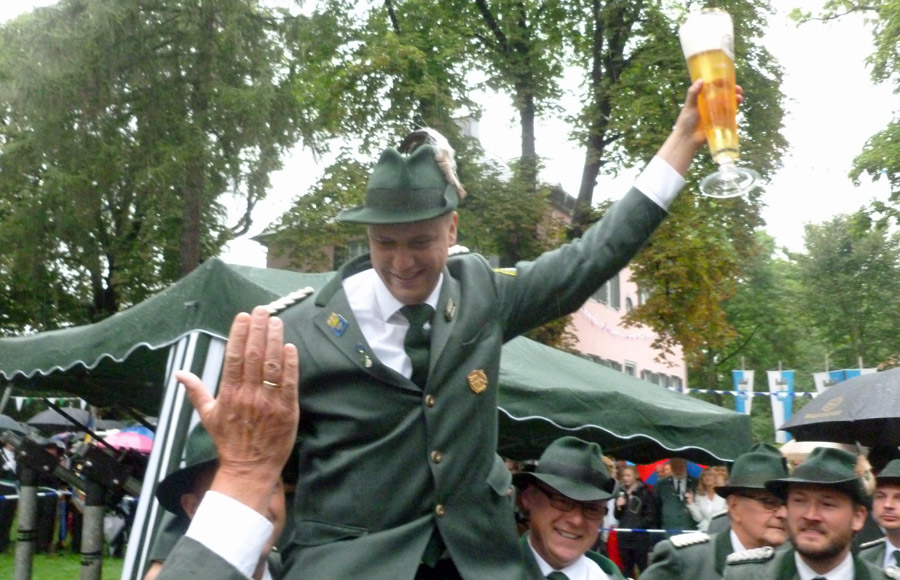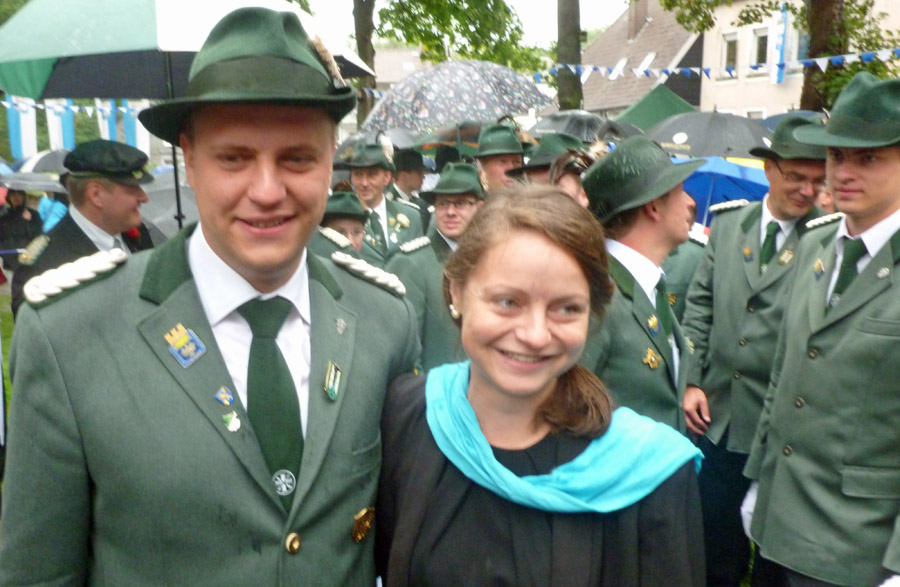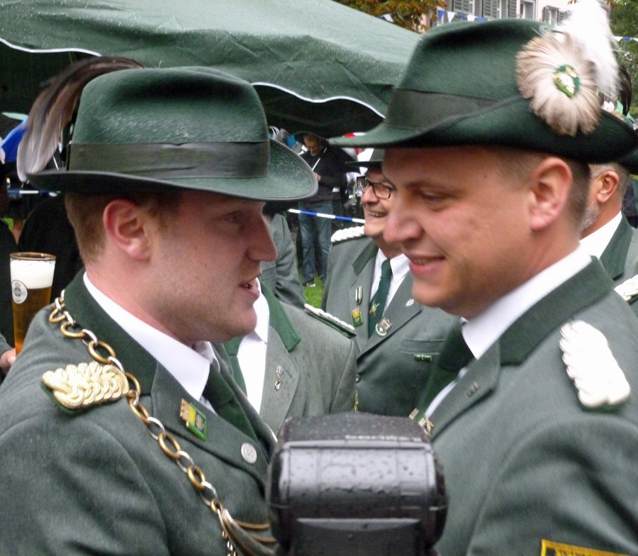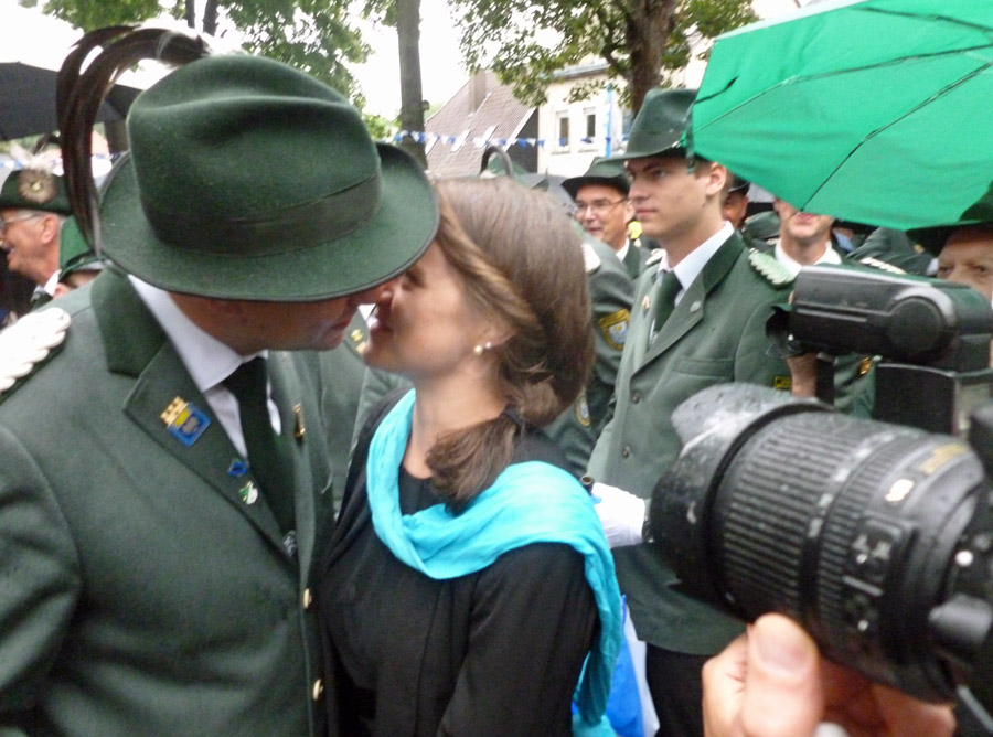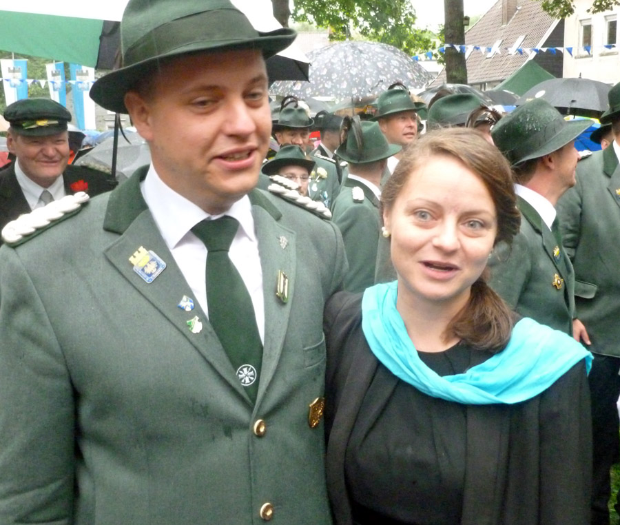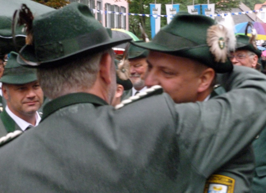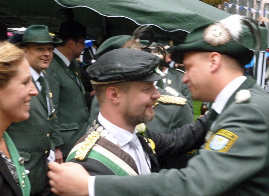 So waren es auch die Mitglieder der 2. Kompanie, die um 9.51 Uhr ganz besonders laut jubelten, als ihr Kandidat endlich mal wieder die Königswürde für seine Farben sicherte. Sebastian Ricke hatte sich ein spannendes, am Ende aber auch schnell entschiedenes Duell mit Marco Reffelmann von der 3. Kompanie geliefert. Im 163. Schuss fiel das letzte Fitzelchen des einst stolzen Aars. Angesichts des Dauerregens, der wie schon beim Festzug am Sonntag unvermindert anhielt, wird er sicher als Regenkönig in die Annalen eingehen. Dem Besuch am Fresekenhof tat das Wetter aber wenig Abbruch. Dicht drängten sich die Schaulustigen unter ihren Schirmen. Sie waren allerdings froh, dass das Schießen nicht allzu lange dauerte und alle zurück ins Zelt konnten.