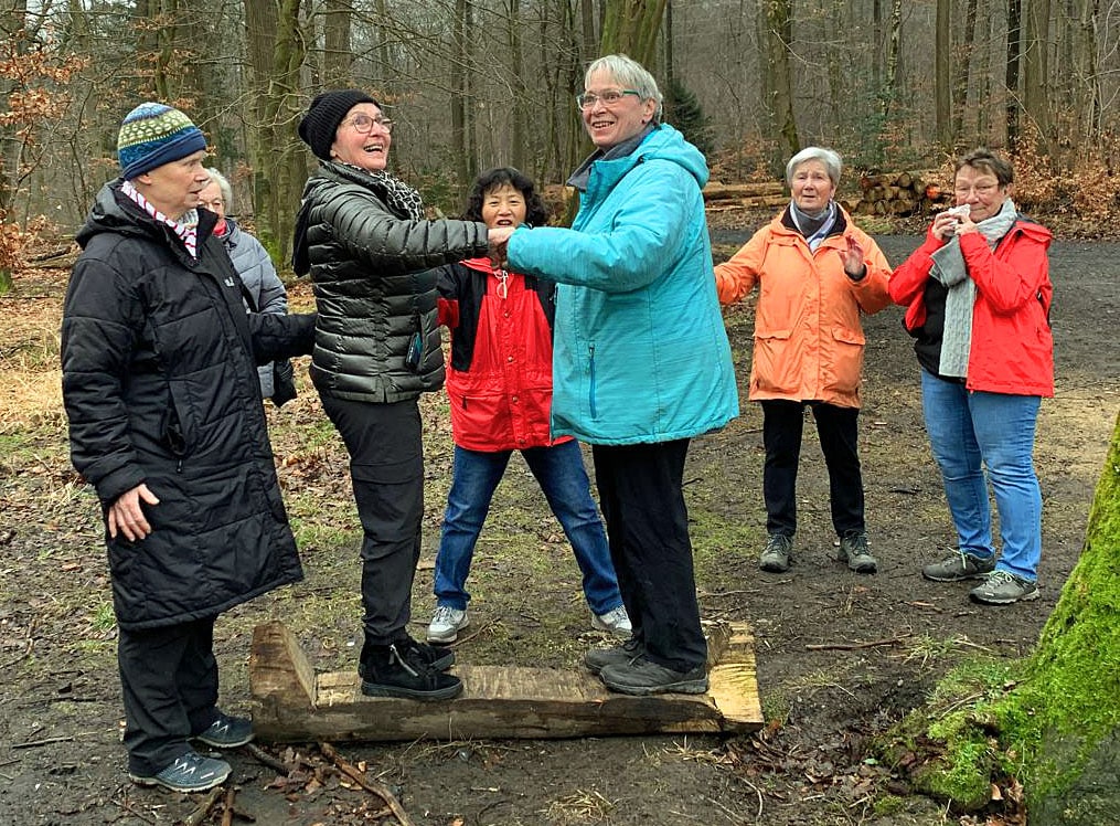 Das Besondere an der Wanderung waren einige leichte gymnastische Übungen, die unterwegs nicht nur für Kurzweil und Abwechslung, sondern auch für Entspannung und eben die gewünschte erhöhte Aufnahme der sauerstoffreichen Waldluft sorgten. Hongxia Zheng gelang es dabei auch, am Wegesrand brauchbares Gerät wie etwa ein Stück Spaltholz für eine Gleichgewichtsübung zu finden.