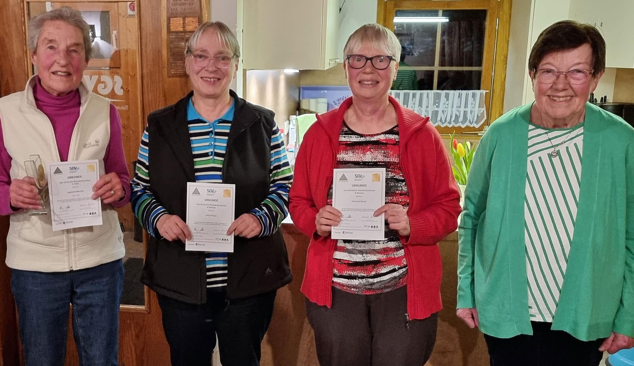 Gleich fünf­mal wur­de das Deut­sche Wan­der­ab­zei­chen an die erfolg­rei­chen Teil­neh­mer ver­ge­ben: in Gold an Gise­la Rose (9. Wie­der­ho­lung) und Bar­ba­ra Heimann (7.), in Bron­ze an Bar­ba­ra Fede­le (2.), Eli­sa­beth und Maria Bar­gel (jeweils 1. Teilnahme).