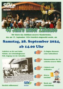„40 Jahre unser Zuhause”. „Die Hütte ist der Mittelpunkt unseres Vereinslebens”, erklärt der Vorsitzende Helmutheinz Welke. Wie seinerzeit bei der Einweihung beginnt das Fest mit einem ökumenischen Gottesdienst um 14.00 Uhr. Anschließend öffnet das Kuchenbüfett und später wird auch der Grill in Betrieb genommen. Erwartet werden neben den eigenen Mitgliedern auch Abordnungen der benachbarten SGV-Abteilungen. Die Hütte wurde nach 14 Monaten Bauzeit am 15. September 1984 in Gegenwart des Bürgermeisters Gerhard Teriet, des Stadtdirektors Dr. Günter Cronau und von etwa 200 Festgästen feierlich eingeweiht. Wegen Terminüberschneidungen kann das Fest jetzt aber erst am 28. September gefeiert werden.