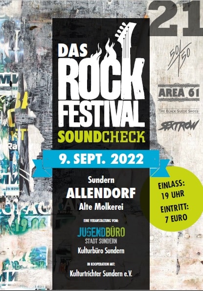 Dieses Jahr ist die Band 50/50 aus Sundern dabei. Die vierköpfige Band bestehend aus York Nitschke, Lennart Hecking, Simon Rüth und Hannes Buchheister beschreibt ihre Musikrichtung als Metal. Die vier Jungs haben ihre Band 2020 gegründet und standen im September 2020 gemeinsam mit „The black suede shoes“, die ebenfalls erstmalig beim Soundcheck dabei sein werden auf einer Open Air-Bühne in Sundern. Die Jungs von 50/50 freuen sich, dass der Soundcheck endlich wieder stattfinden darf und wollen das Publikum ordentlich mit ihrer Musik mitreißen. Die Alte Molkerei in Allendorf bietet dafür den richtigen Rahmen.