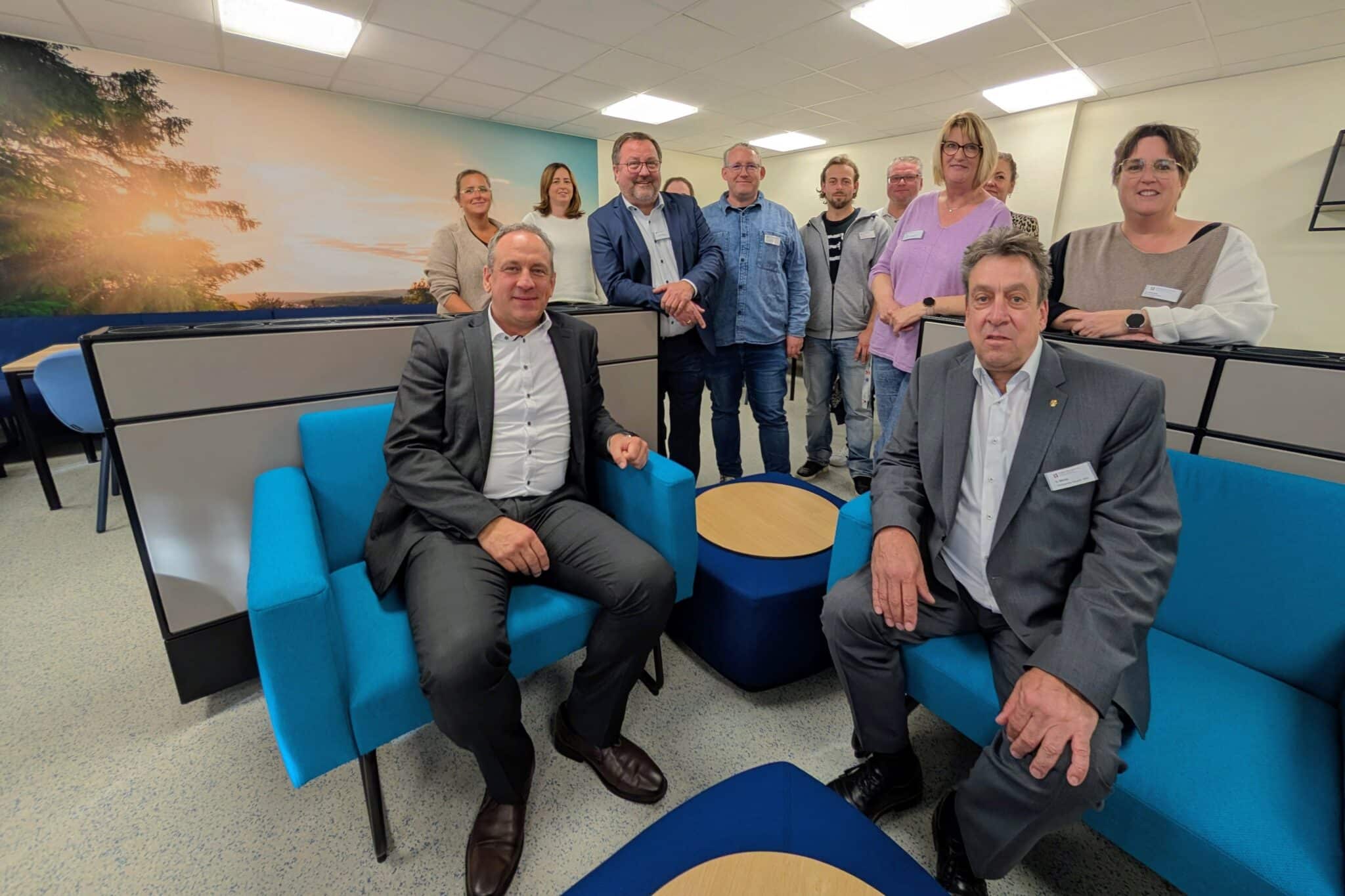 „Der Raum kann insbesondere von den Beschäftigten am Standort in Neheim genutzt werden“, erklärt Ulrich Mönke, Vorsitzendender des Fördervereins und der GMAV. Damit konnte jetzt eine Lücke geschlossen werden, denn außerhalb der Öffnungszeiten der Caféteria im Hause, gab es keine geeignete Pausenmöglichkeit. Der neue Sozial- und Pausenraum ist nach gemeinsamer Planung ausgestattet worden und verfügt jetzt über eine qualitativ hochwertige und ansprechende Möblierung. Hier lassen sich die eigenen Mahlzeiten einnehmen, für deren Zubereitung eine Küchenzeile mit Mikrowelle und Kühlschrank im Sozialraum zur Verfügung steht. Auf bequemen Sofas und Sesseln können die Mitarbeiten ihre Pause genießen, entspannen oder den Raum für den kreativen Austausch nutzen. Das Lichtsystem im Sozialraum ermöglicht dabei verschiedene Lichtszenarien. „Es ist sehr gemütlich“, beschreibt Mönke die Einrichtung und Ausstattung.