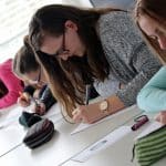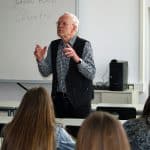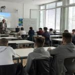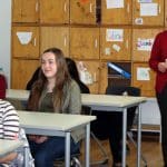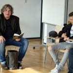 Auch die Teilnehmer der Lyrik-Lesung zeigten sich begeistert und freuten sich über das ihnen geschenkte Exemplar “Engel im Herbst mit Orangen” von Hellmuth Opitz. Der ehemalige Sänger, Bassist und Gitarrist hätte den Schüler/innen im ausgewählten Musikraum mit Gitarre, Trommeln und Schlagzeug sicherlich auch noch musikalisch einheizen können, unterließ dies jedoch aus Rücksichtnahme auf die benachbarten Lesungen und Workshops. Dennoch war den Schülerreaktionen deutlich zu entnehmen, dass sie den Autor als Typen wahrgenommen haben und seine aus dem Alltag gerissenen Gedichte in bildlicher Sprache folgten. Hellmuth Opitz lobte die Mitarbeit der Schüler/innen, die sich auch im Bereich der Interpretation bewegte.