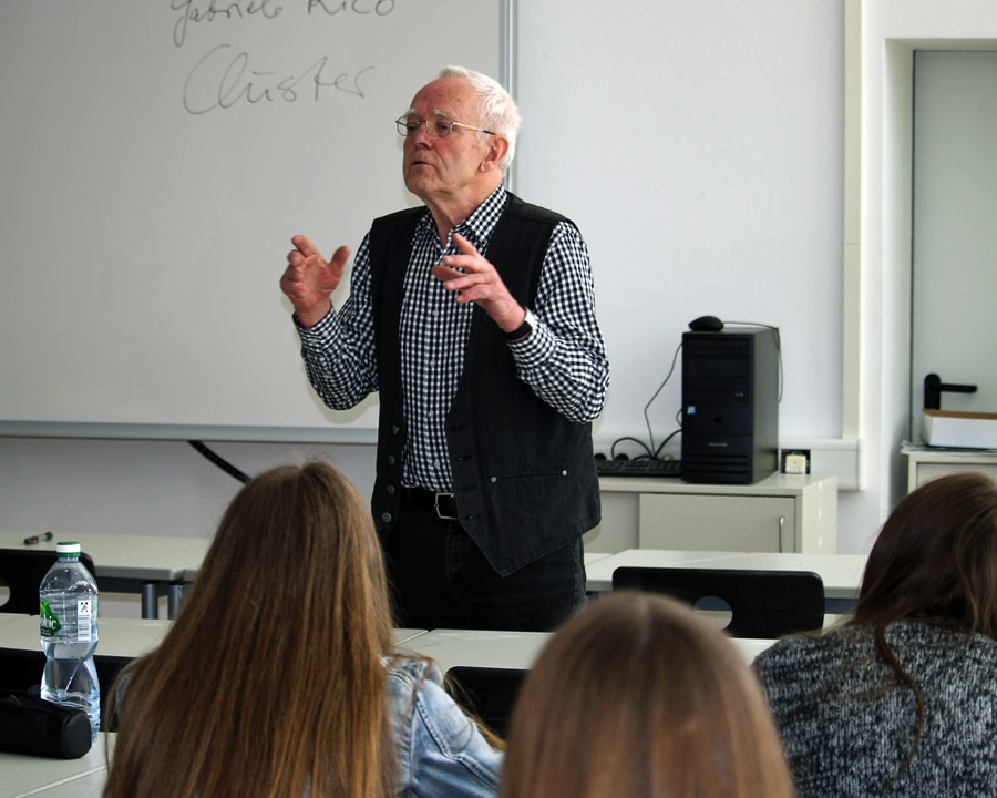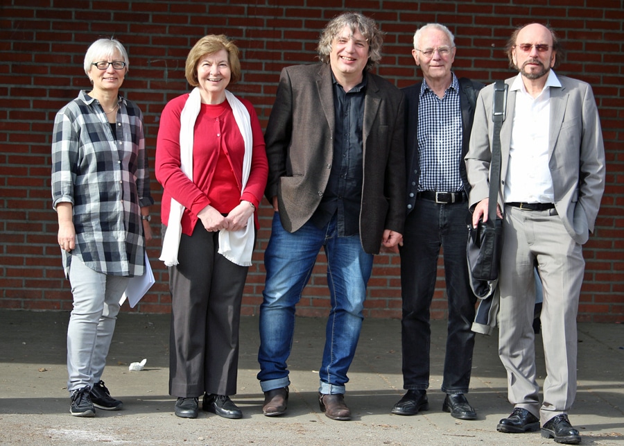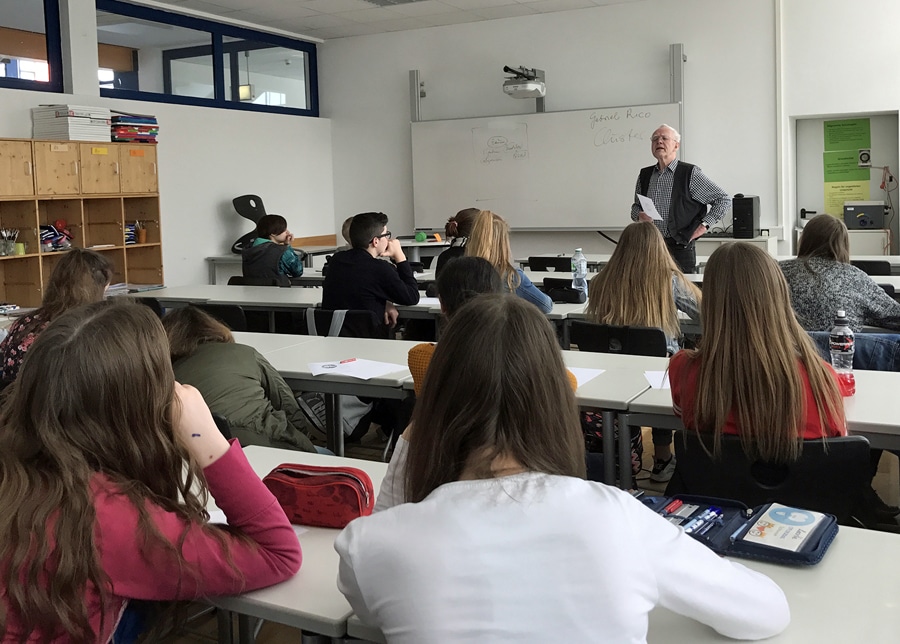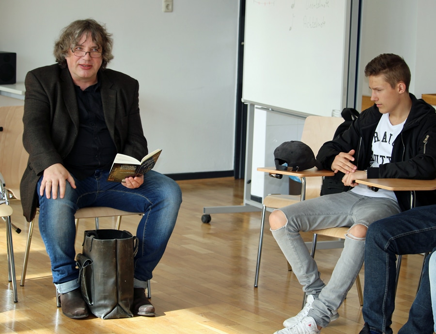 Auch die Teilnehmer der Lyrik-Lesung zeigten sich begeistert und freuten sich über das ihnen geschenkte Exemplar “Engel im Herbst mit Orangen” von Hellmuth Opitz. Der ehemalige Sänger, Bassist und Gitarrist hätte den Schüler/innen im ausgewählten Musikraum mit Gitarre, Trommeln und Schlagzeug sicherlich auch noch musikalisch einheizen können, unterließ dies jedoch aus Rücksichtnahme auf die benachbarten Lesungen und Workshops. Dennoch war den Schülerreaktionen deutlich zu entnehmen, dass sie den Autor als Typen wahrgenommen haben und seine aus dem Alltag gerissenen Gedichte in bildlicher Sprache folgten. Hellmuth Opitz lobte die Mitarbeit der Schüler/innen, die sich auch im Bereich der Interpretation bewegte.