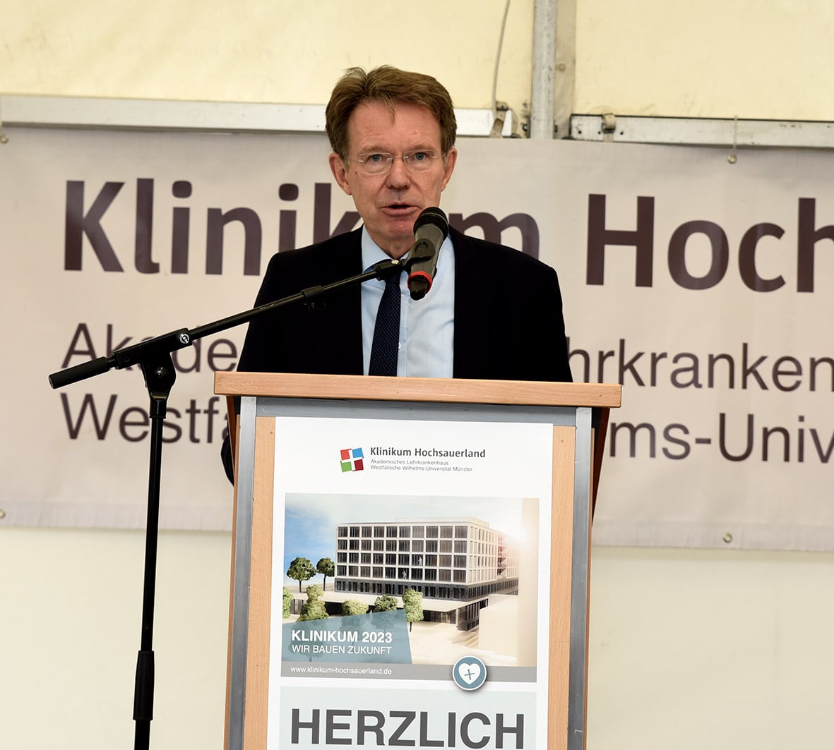 Das Investitionsvolumen liegt bei 88 Millionen Euro, 62,5 Millionen Euro sind förderfähige Baukosten. Das Land NRW fördert den Neubau mit 28,17 Millionen Euro und betrachtet das Vorhaben als wichtig für die Sicherung der Versorgung. In seinem Grußwort zum Spatenstich würdigt NRW-Gesundheitsminister Karl-Josef Laumann das Vorhaben als „Meilenstein“ in der Geschichte des Klinikums. Damit werde der Grundstein für eine auch in Zukunft hochwertige und wohnortnahe medizinische Grundversorgung für den gesamten Hochsauerlandkreis gelegt