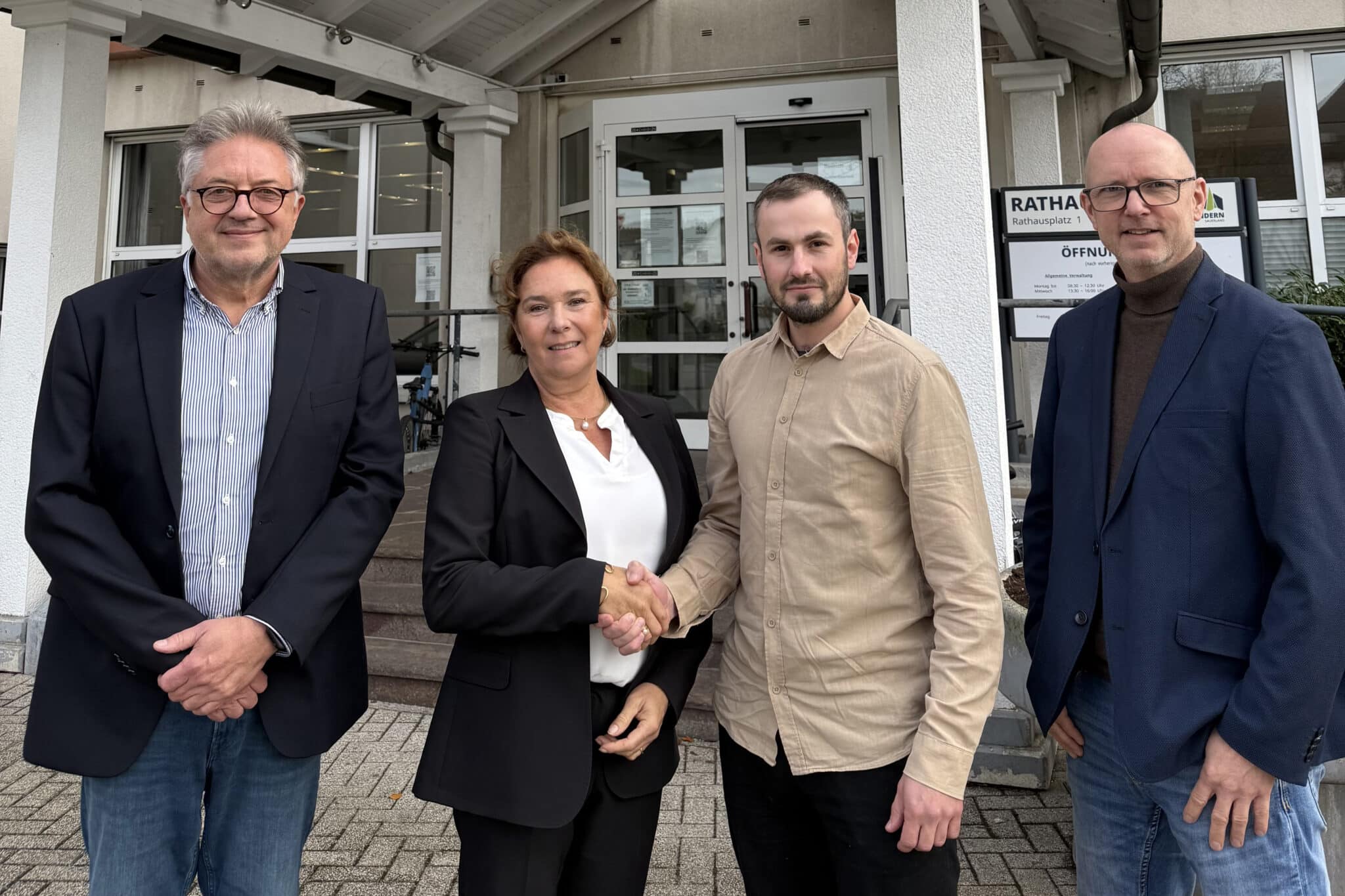 v.l.: Micha­el Schä­fer (Abtei­lungs­lei­ter 3.1 Stadt­ent­wick­lung und Umwelt), Dr. Jac­que­line Bila (Bür­ger­meis­te­rin der Stadt Sun­dern), Mal­te Hoff­mann (Kli­ma­ma­na­ger der Stadt Sun­dern), Hol­ger Böse (Fach­be­reichs­lei­ter 3 Stadt­ent­wick­lung und öffent­li­che Infra­struk­tur) (Foto: Stadt Sundern)
