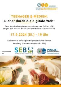 Arns­berg. Die Stadt­schul­pfleg­schaft Arns­berg und der Stadt­el­tern­bei­rat Arns­berg bie­ten am Diens­tag, 17.9.2024, einen Vor­trag zum The­ma „Teen­ager & Medi­en: Sicher durch die digi­ta­le Welt!“ für Eltern und päd­ago­gi­sche Fach­kräf­te an.