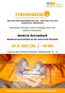 Arns­berg. Was tun, wenn das eige­ne Kind Opfer von Cyber­mob­bing gewor­den ist? Um die­ses The­ma geht es bei einem Vor­trag der Stadt­schul­pfleg­schaft (SSP) Arns­berg am 29.9. Als Refe­ren­ten konn­te die SSP den Medi­en­wis­sen­schaft­ler Hen­drik Mut­zen­bach von der Uni­ver­si­tät Bie­le­feld gewin­nen. In sei­nem Vor­trag wird er dar­auf ein­ge­hen, wel­che Maß­nah­men im Ernst­fall sinn­voll und ziel­füh­rend sind – und wel­che die Situa­ti­on nur schlim­mer machen. Dies ver­deut­licht Mut­zen­bach anhand von rea­len Fall­bei­spie­len, die Schlag­zei­len gemacht haben. Die Zuhörer/innen erfah­ren aber auch, wie sich Cyber­mob­bing ver­hin­dern oder im Keim ersti­cken lässt.
