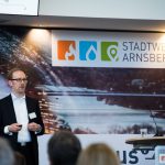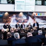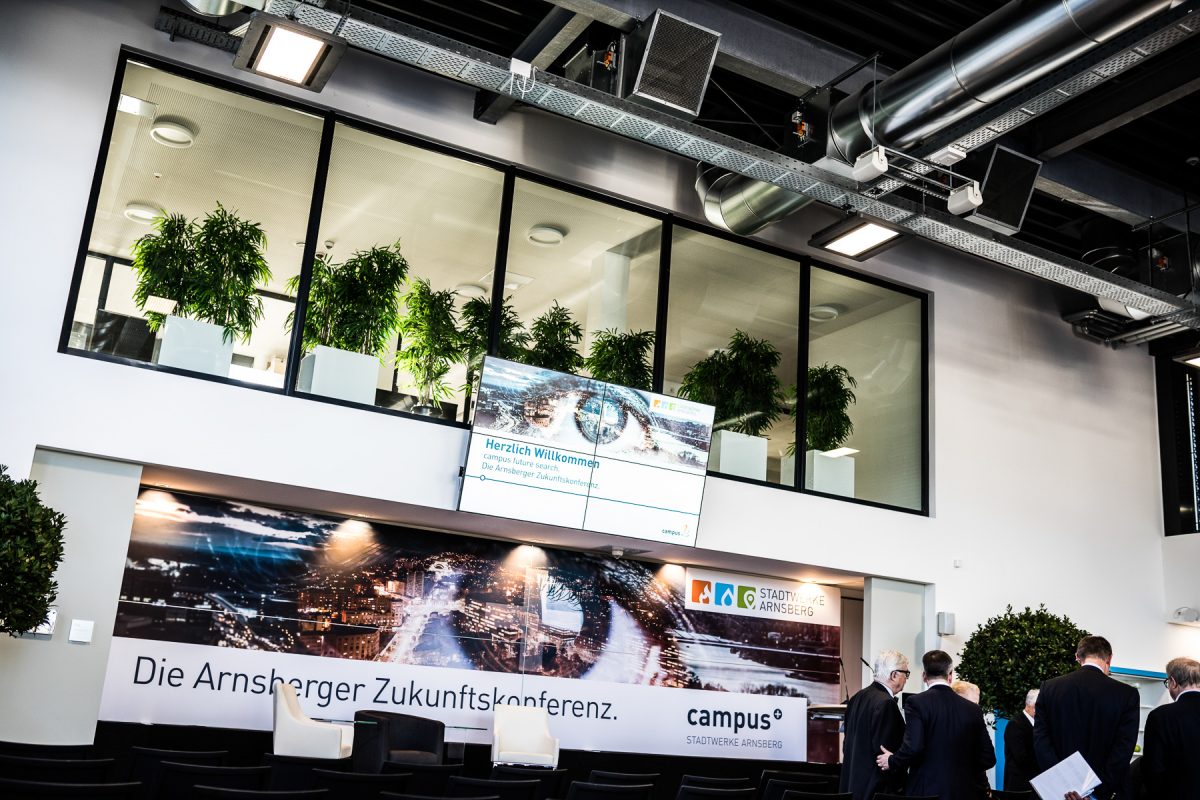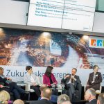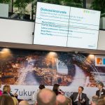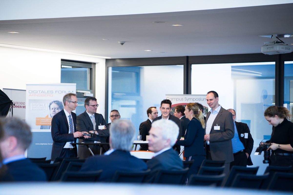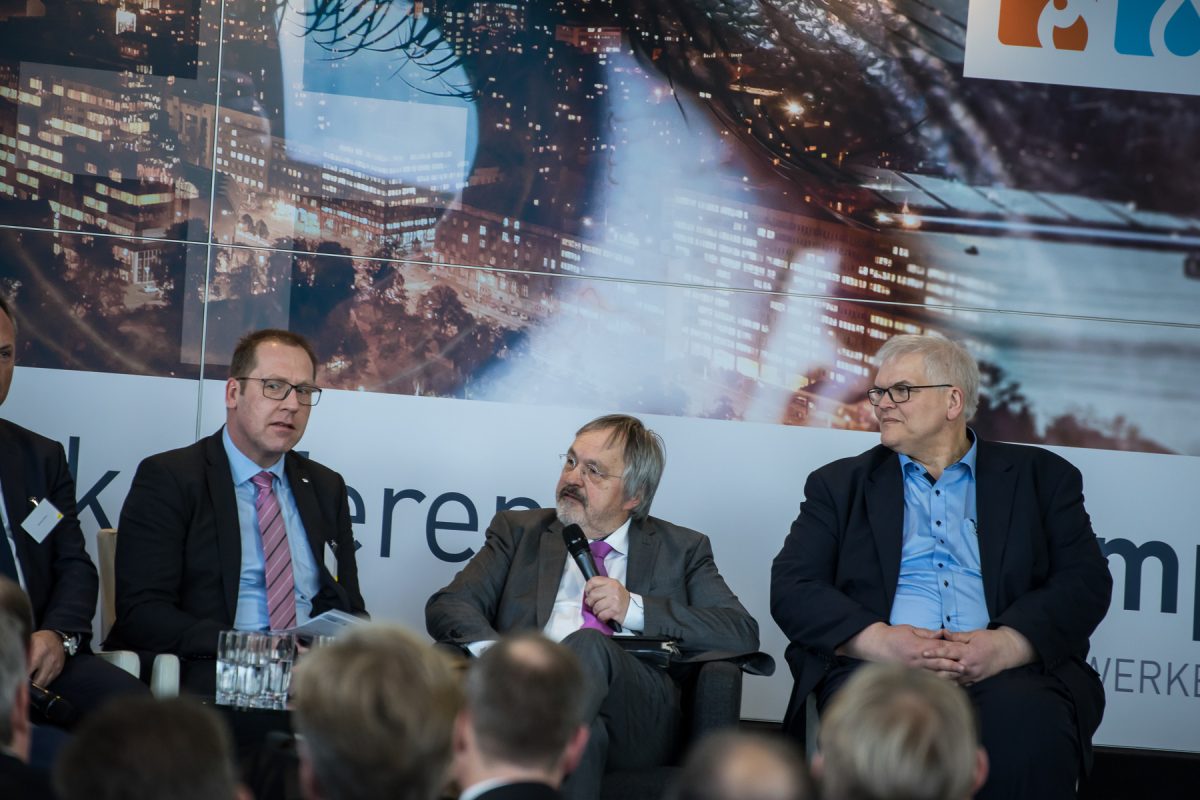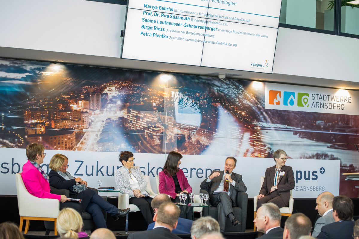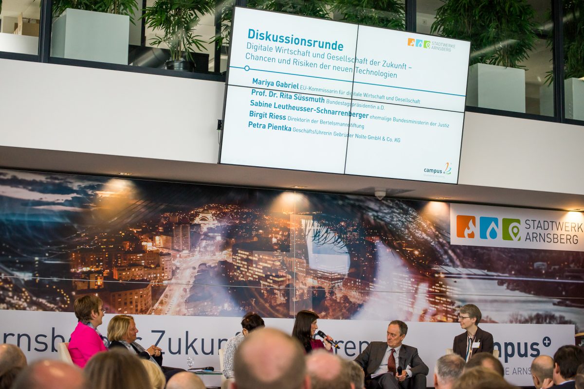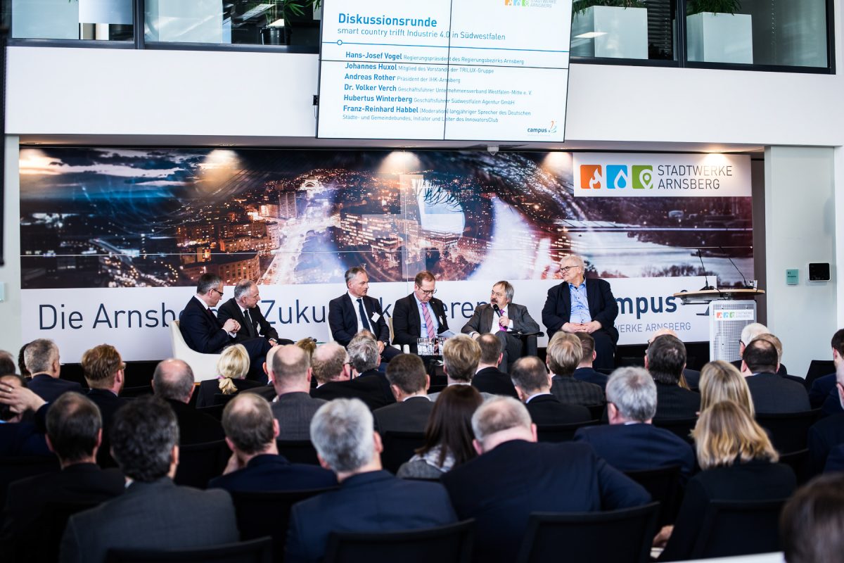 Es folgte eine Diskussionsrunde zur Industrie 4.0 in Südwestfalen an, bei der sich Regierungspräsident Hans-Josef Vogel, Trilux-Geschäftsführer Johannes Huxol, IHK-Präsident Andrea Rother, Unternehmerverbands-Geschäftsführer Volker Verch, Chef der Südwestfalen Agentur Hubertus Winterberg unter der Leitung des Moderators Franz-Reinhard Habbel beteiligten.