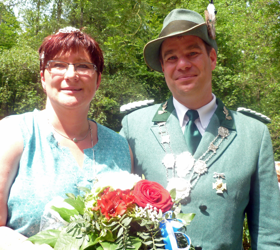 Bereits um 10.44 Uhr war der aufregende Kampf um die Rumbecker Königswürde entschieden. Stefan Becker setzte sich in einer engen Entscheidung durch gegen seine Mitbewerber Raimund Lübben und Wolfgang Krien, der sein Glück auch schon acht Tage zuvor in Uentrop versucht hatte. Im 124. Schuß war der Königsvogel unten. Als wesentlich zäher erwies sich dagegen der hölzerne Traktor, den die Geckbewerber aufs Korn nahmen. Oder lag es an den Schießkünsten? Hier mussten die Schießmeister sogar sechs Pakete Munition nachliefern lassen, bevor bei inzwischen durchaus sommerlichen Temperaturen eine Entscheidung fiel . Im 166. Schuss konnte dann endlich Jörg Beddermann jubeln. Mit dem 39-jährigen Elektroniker, der bei RWE tätig ist, wurde der Ehemann der neuen Königin Geck. Sein Kommentar, als ihn die Schützenbrüder beglückwünschten: „Jetzt muss das neue Badezimmer warten!“