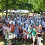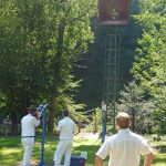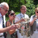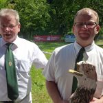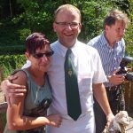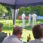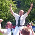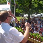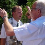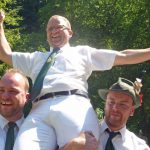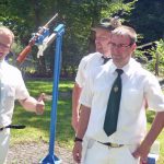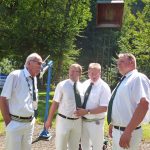 „Die kriegen ja noch einen Sonnenbrand,“ machte sich ein Altmonarch Sorgen, als die Kandidaten zur Mittagszeit bei über 30 Grad für Muffrikaner Verhältnisse ungewohnt lange um die Königswürde rangen. „Der alte Besenstiel existiert nicht mehr. Erstmals ist in Muffrika der Vogel auf eine Zentralschraube aufgesetzt,“ hatte der Vorsitzende Meinolf Neumeister zuvor die Festbesucher über eine wichtige Änderung aufgeklärt, die infolge verschärfter Bestimmungen notwendig geworden war. Niemand wagte eine Prognose, wie lange es dauern werde, bis der Vogel fällt. Es war schließlich 13.11 Uhr, als Stefan Elsner den entscheidenden Treffer platzierte. Zuvor hatte er sich mit dem rechten Flügel auch die letzte Trophäe gesichert. Krone und Apfel schoss Gerd Wefing ab, während Dr. Martin Hennecke das Zepter herunter holte. Insgesamt wurden 726 Patronen abgefeuert. Lange warten mussten die Muffrikaner dann auch auf ihren neuen Jugendkönig. Der heißt Henning Weber.