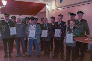 Ein besonderes Jubiläum hatte auch Heinz-Otto Schmelzer, der für 70 Jahre geehrt werden sollte, aber krankheitsbedingt nicht anwesend sein konnte. Des Weiteren wurde noch eine Ehrung aus dem Corona-Jahr 2020 nachgeholt. Hier wurde Dieter Gerling mit einem Orden und einer Urkunde für 50 Jahre Mitgliedschaft bedacht. Ihnen allen gratulierte Brudermeister Uwe Hecking sehr herzlich und dankte für die jahrzehntelange Treue zum Verein.