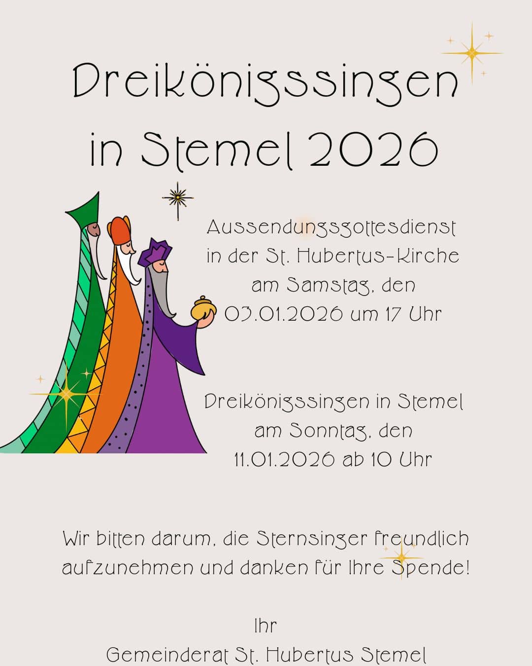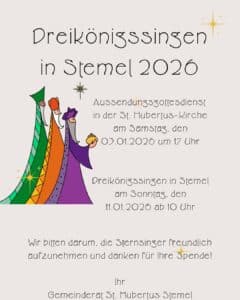 Sundern/Stemel. Der Gemeinderat St. Hubertus Stemel lädt alle Gemeindemitglieder und Gäste am kommenden Samstag, 3. Januar 2026, um 17 Uhr zum Aussendungsgottesdienst der Sternsinger in die Sankt Hubertus-Kirche ein.